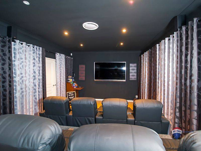 A practical downstairs bedroom with built in robe and two-way bathroom is situated at the front of the house. A huge private home theatre fully equipped with cinema chairs and a raised seating platform with provision for a screen and projector caters to the movie and sports lovers of the family.