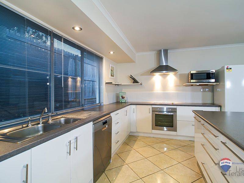 The kitchen features a breakfast bar and plenty of storage space. From there the home flows to the expansive weatherproofed covered outdoor entertaining area perfect for year-round alfresco dining and entertaining. Adjoining the extended pergola is the fenced landscaped back yard