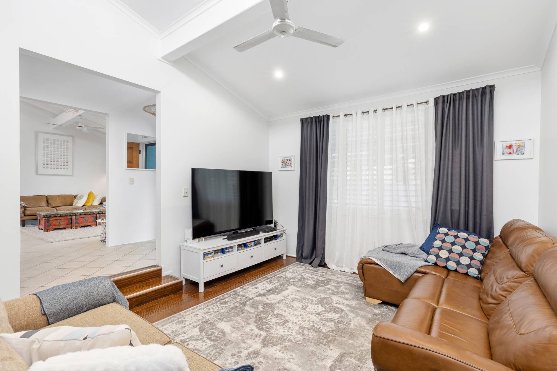 The sunken lounge is a second living area featuring timber flooring, raked ceilings, ceiling fan and is the perfect extra living area.