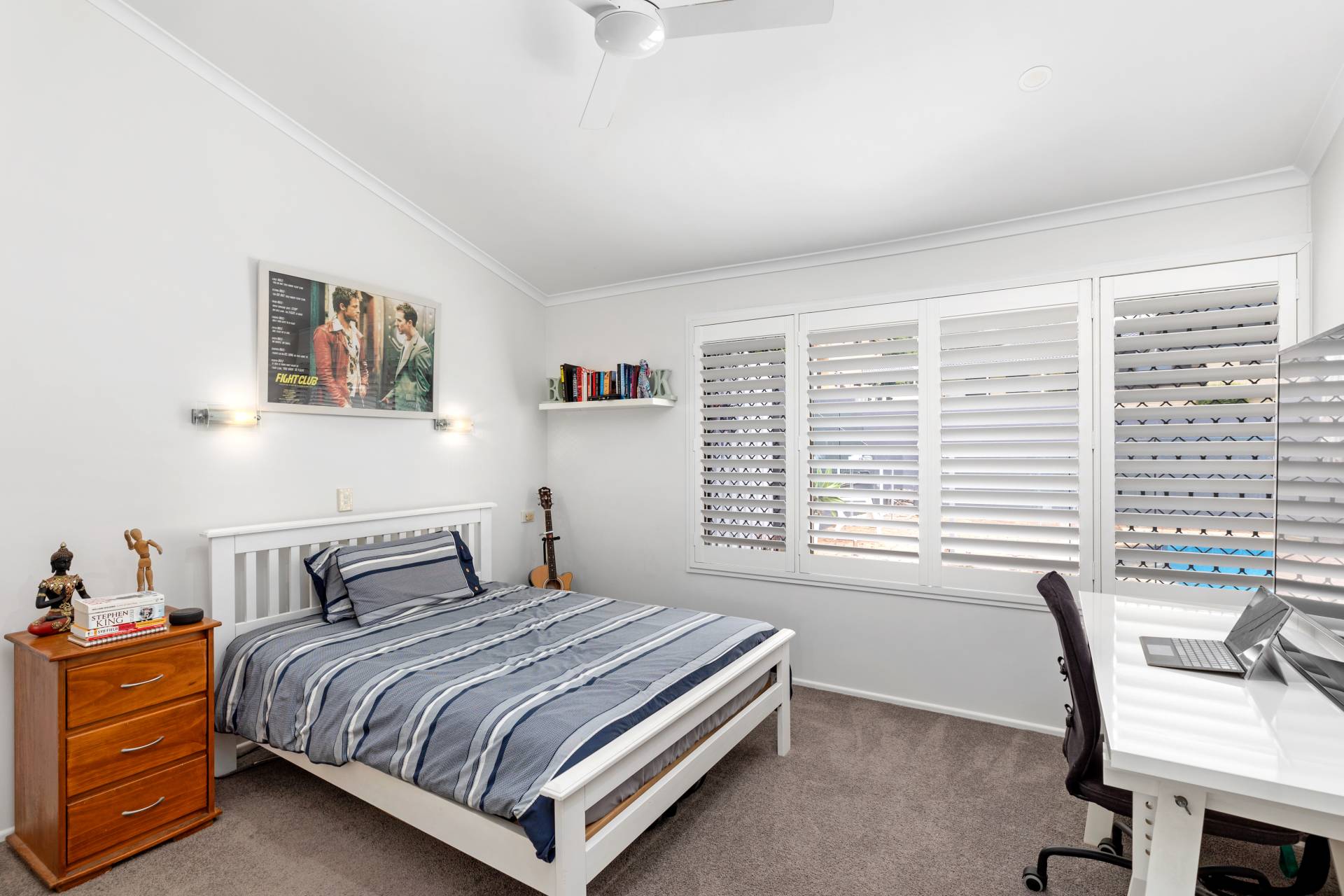 Bedroom 2 features a view over the sparkling in-ground pool, white venetian Blinds, mirrored built-in wardrobe and plush carpet flooring.