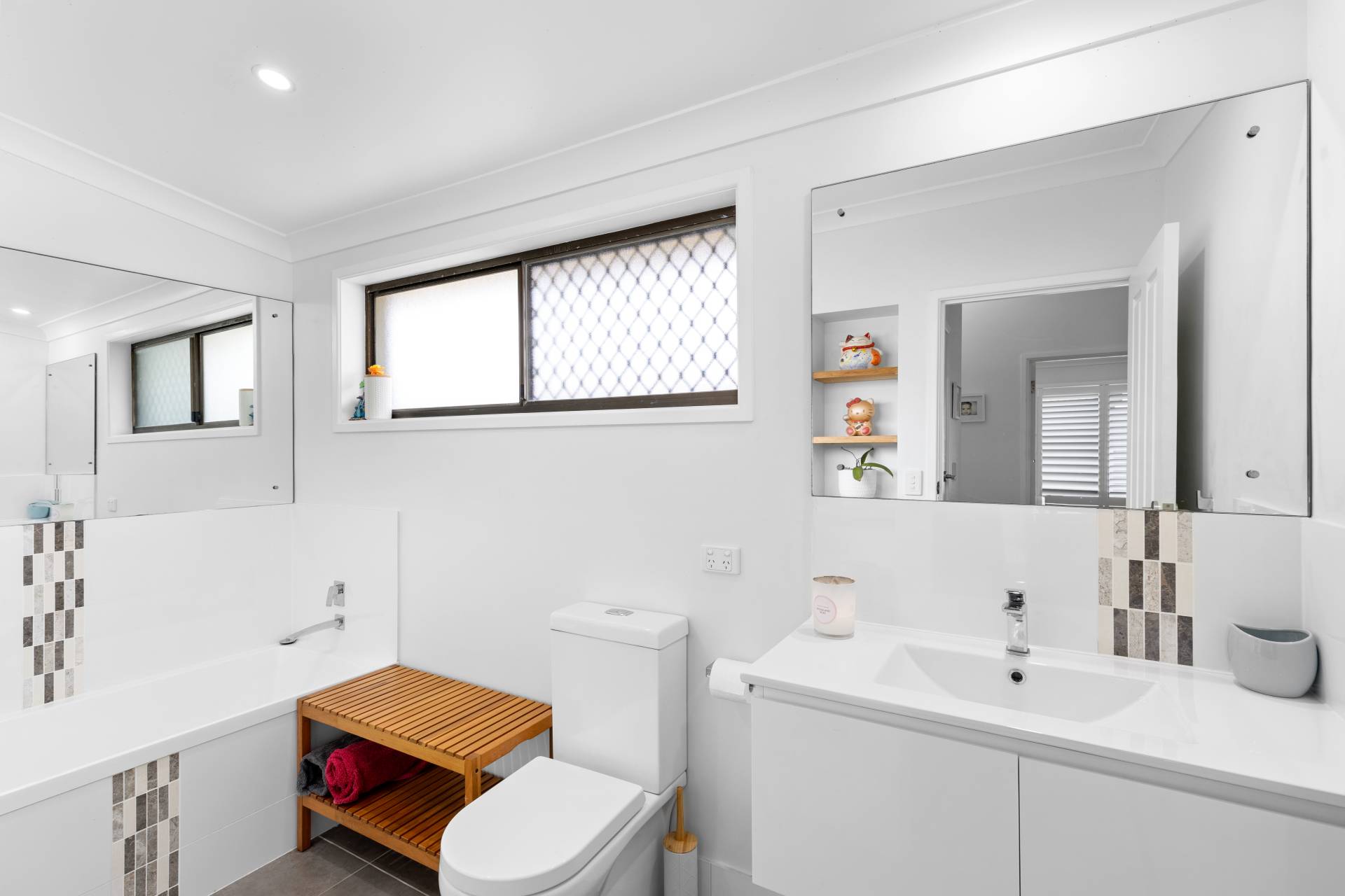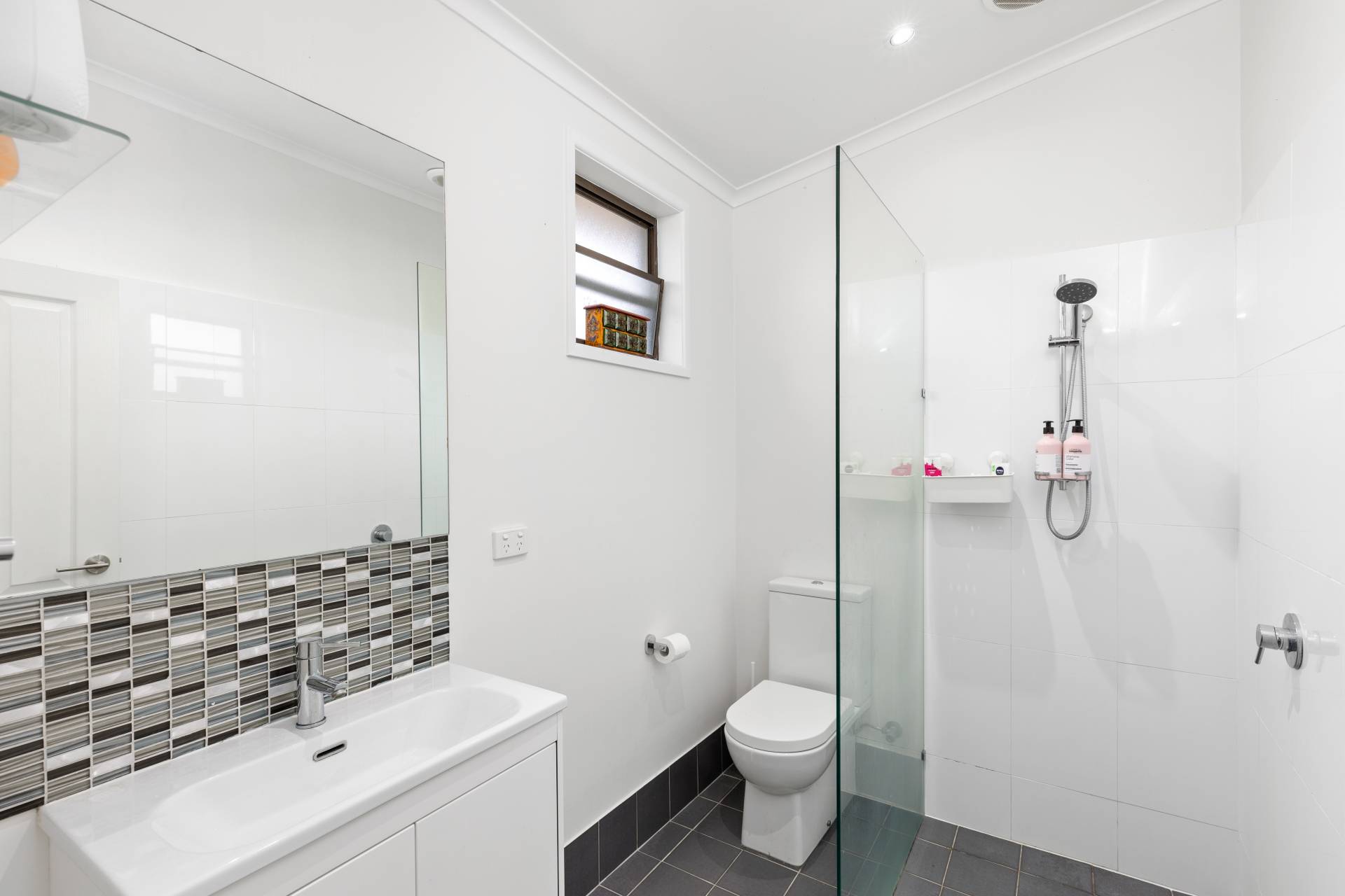 The second bathroom features a single basin with plenty of storage, large frameless walk-in shower and toilet.