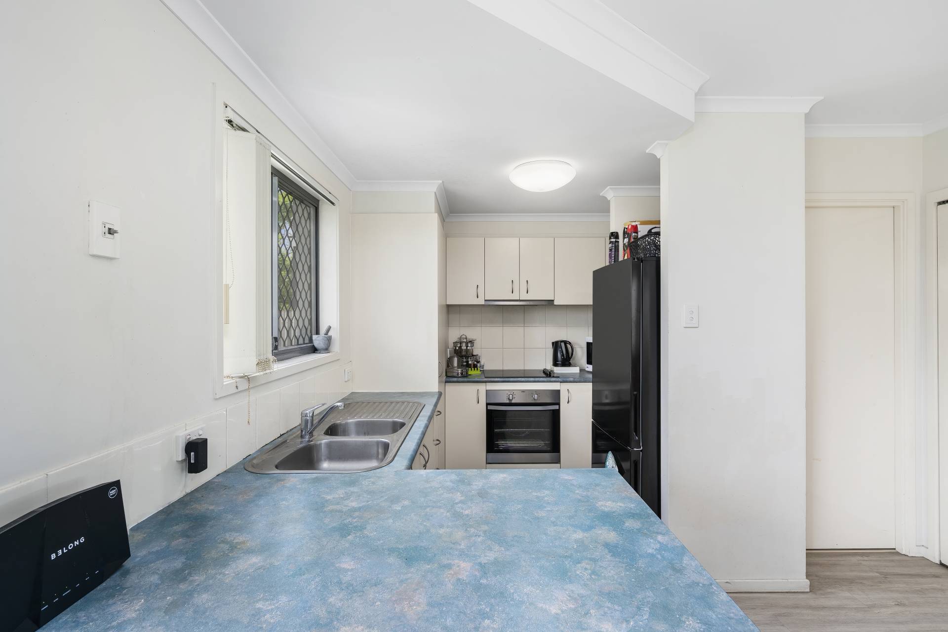 This property is light and airy with light timber look floors, sliding door to the outside area. The kitchen is well appointed, under-bench oven with ceramic hotplates, exhaust fan above and double sink with window above.