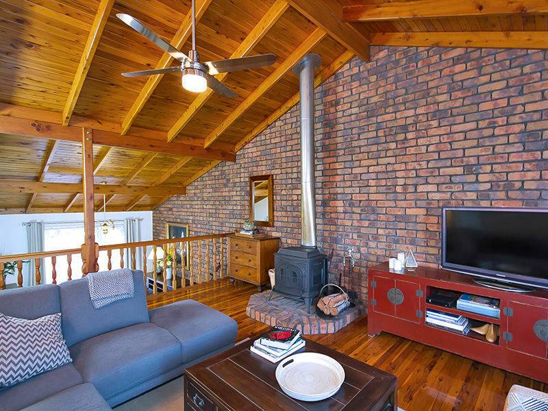 ...LEVEL 2. Two built in bedrooms with Stunning Views to the distant mountains share a modern bathroom. In the smaller bedroom there is an access to the Attic where there is endless storage for all those bulky items. On this level but on the opposite side of the house is the fourth bedroom with built-ins. A spacious Living room with Combustion wood heater and high raked ceilings brings the family together and adjoins the front Balcony which takes advantage of the top level a perfect vantage point and watch the beautiful Sunsets across the distant mountains.
