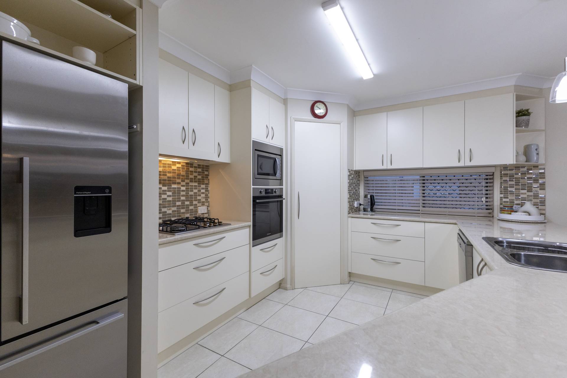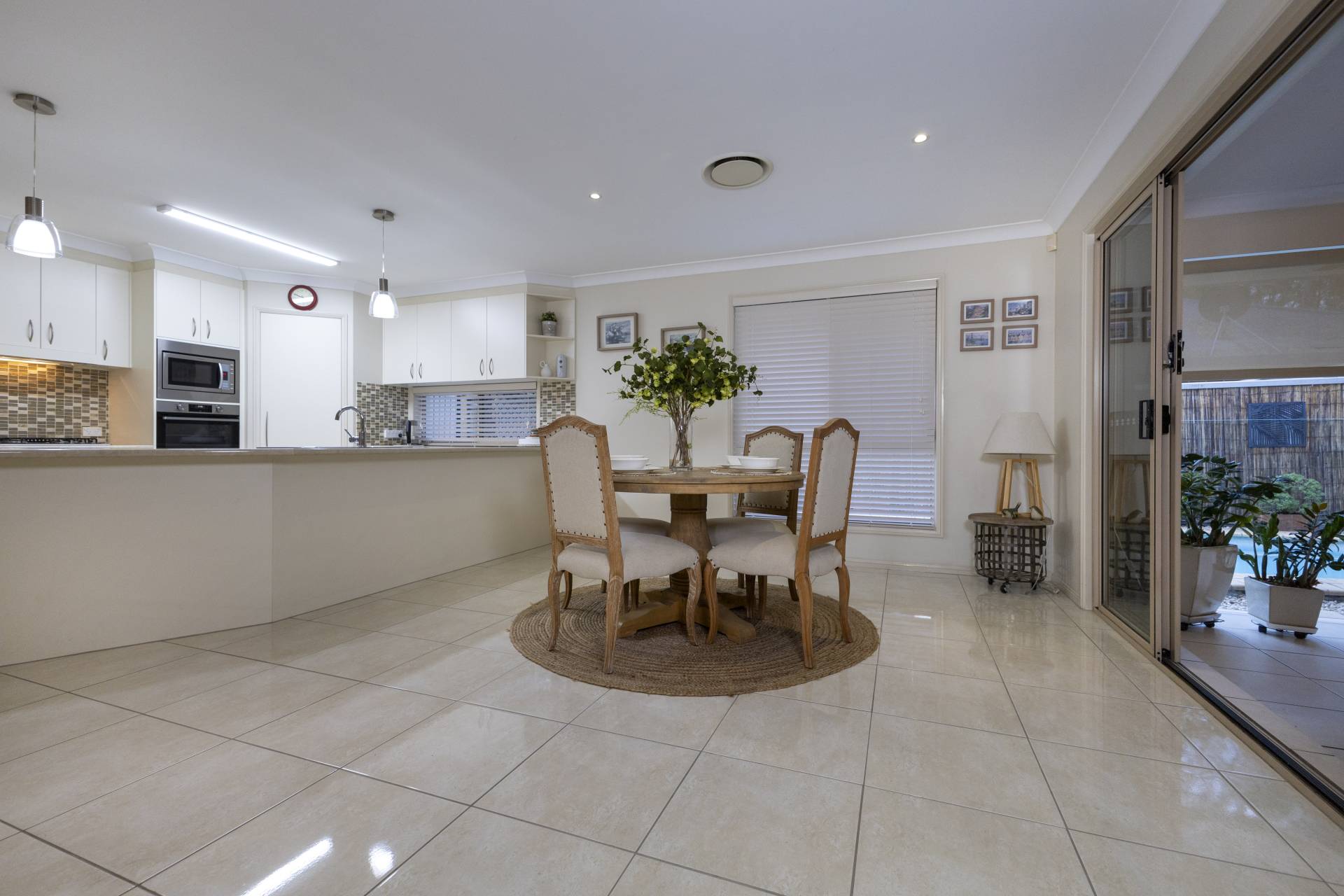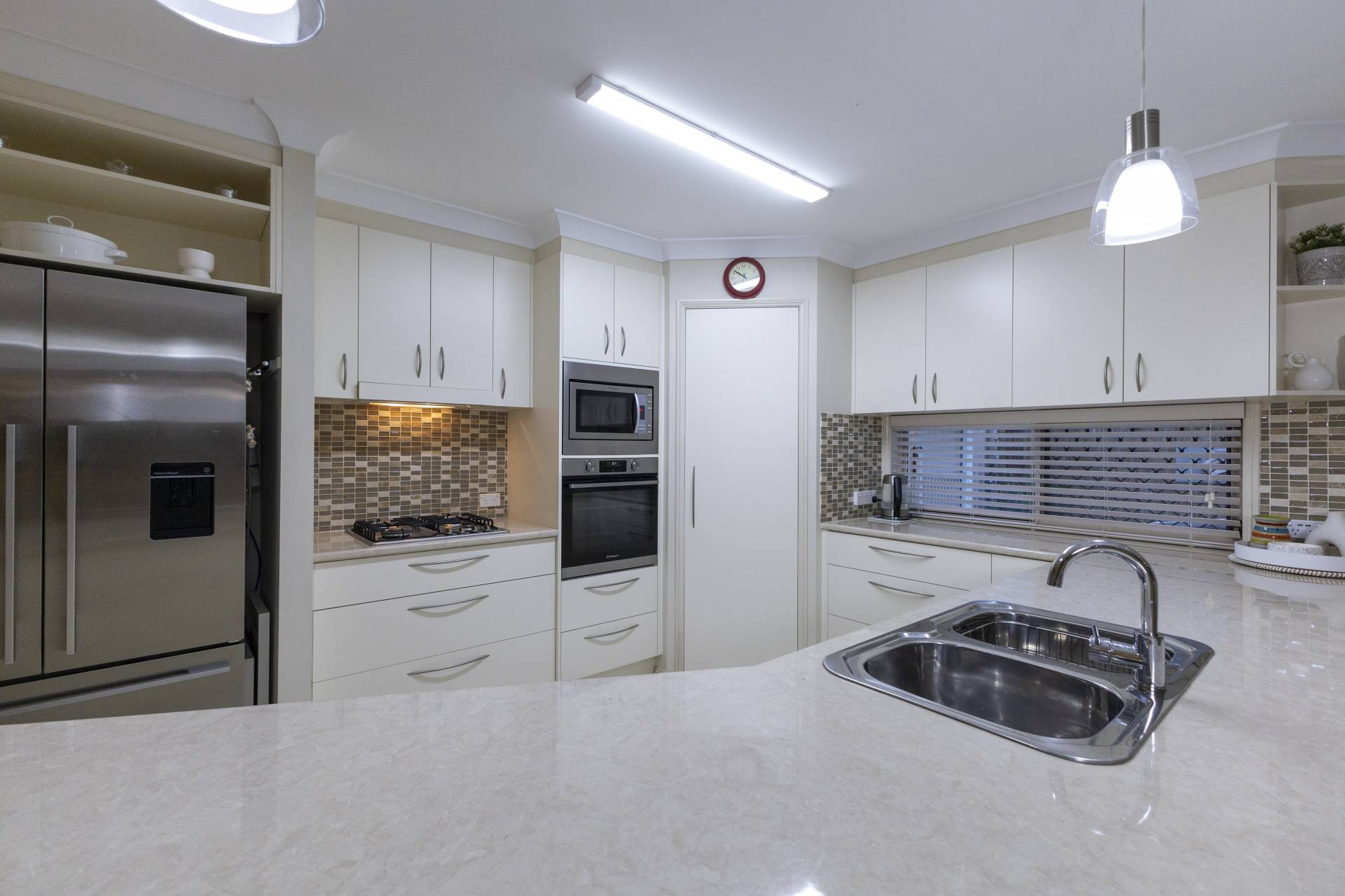 The spacious kitchen has loads of cupboard and bench space and overlooks the outdoor swimming pool and low maintenance gardens.