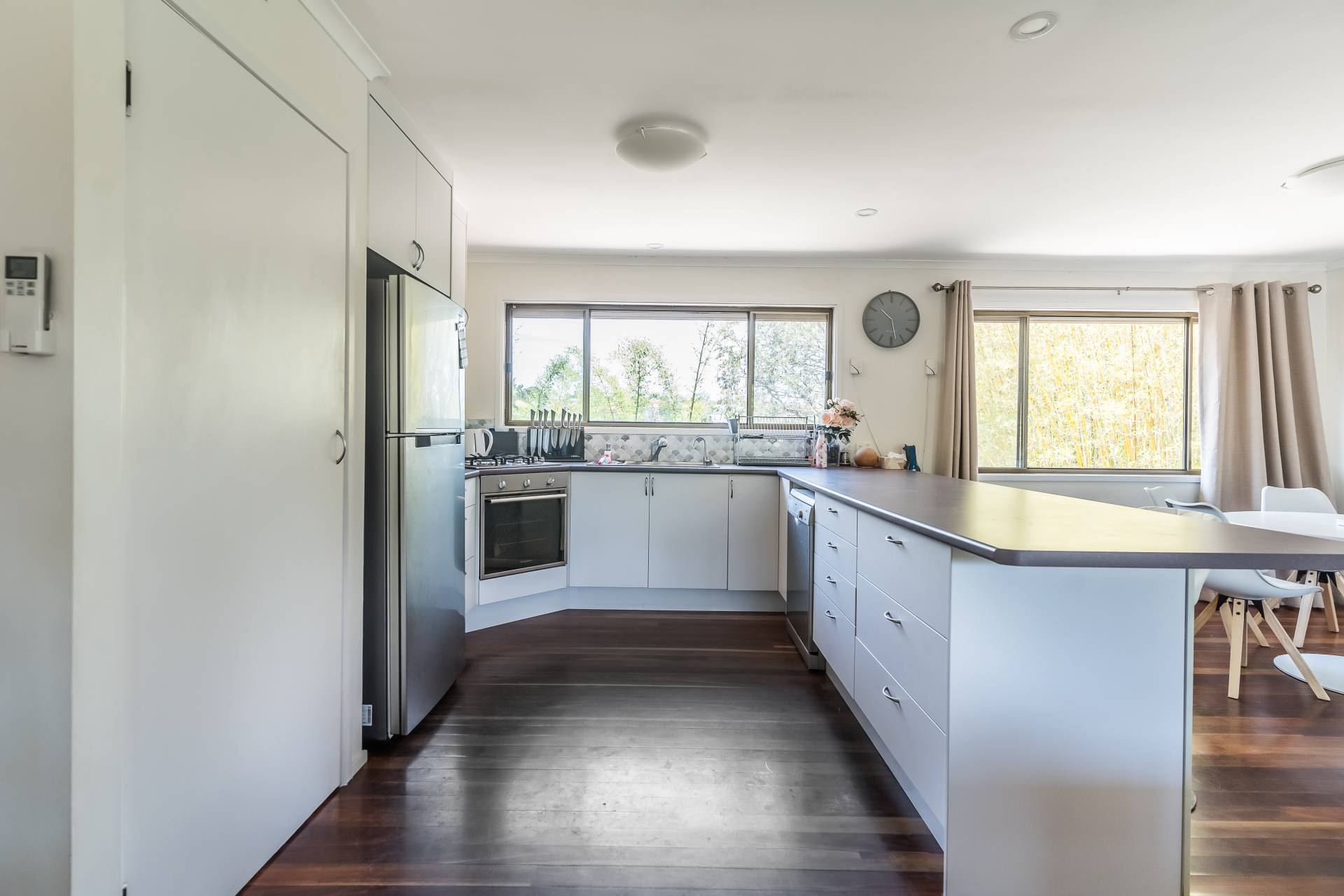 A functional, central and well-equipped kitchen includes gas cooking, dishwasher, breakfast bar and has lovely elevated views. Adjoining the living room is a quaint front balcony to enjoy a glass of wine!