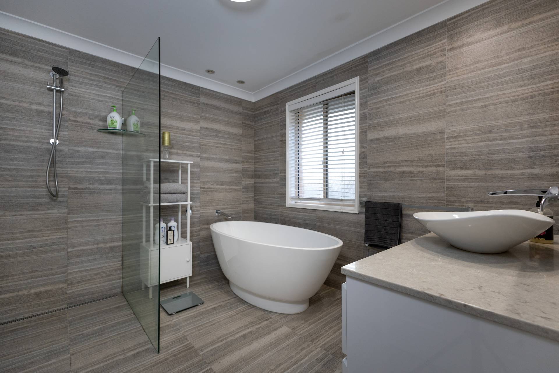 - Luxurious modern family bathroom with stand alone bath tub