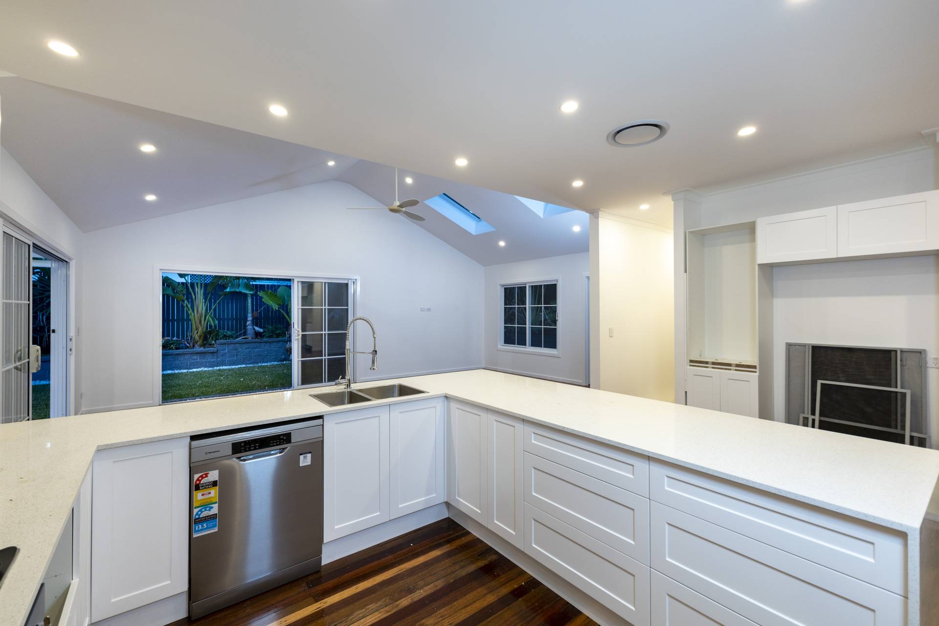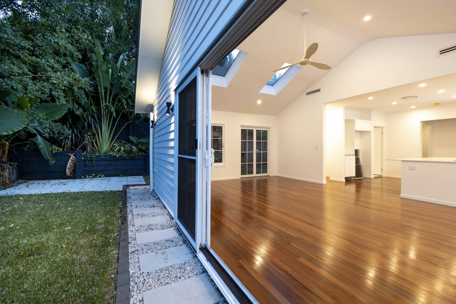 This freshly renovated family home offers a modern and spacious open plan living and dining area boasting high ceilings, with adjoining kitchen featuring a gas cooktop, oven, and dishwasher, with ceiling fan and ducted air conditioner throughout.