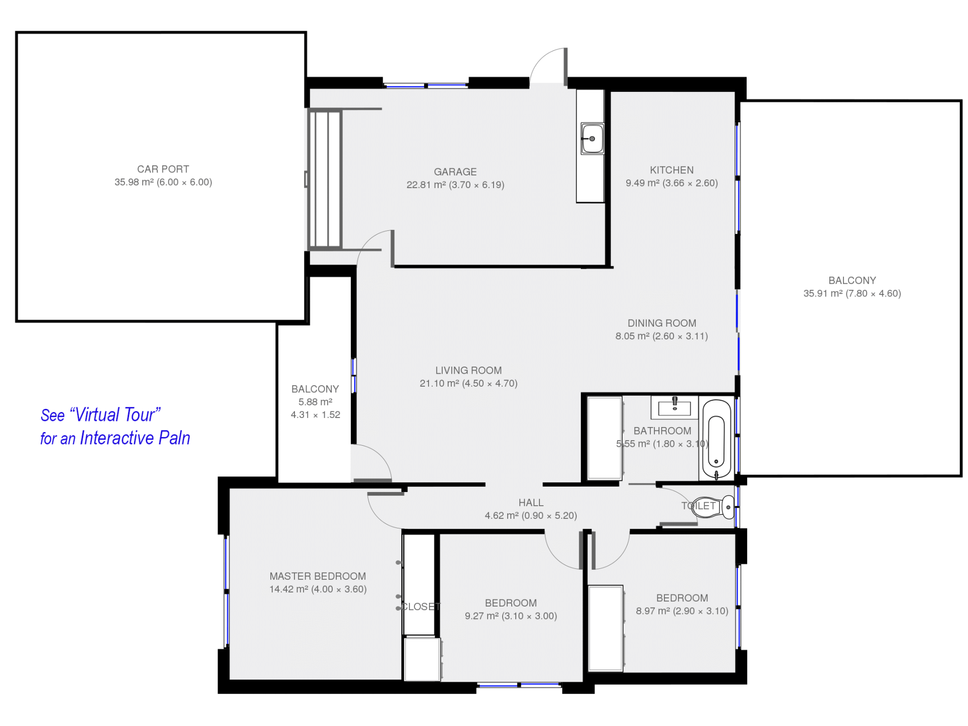- Open plan living and dining areas.