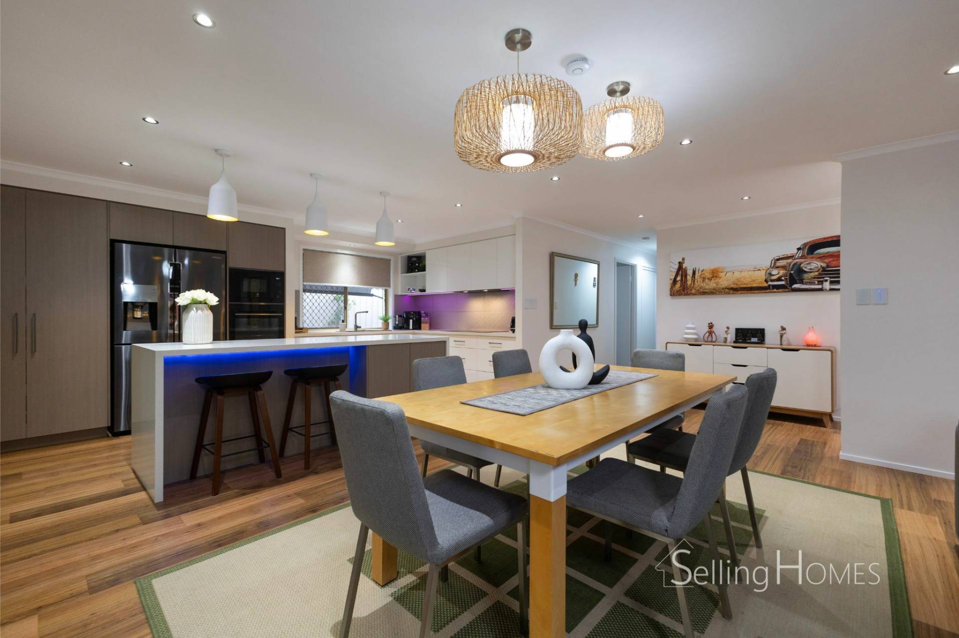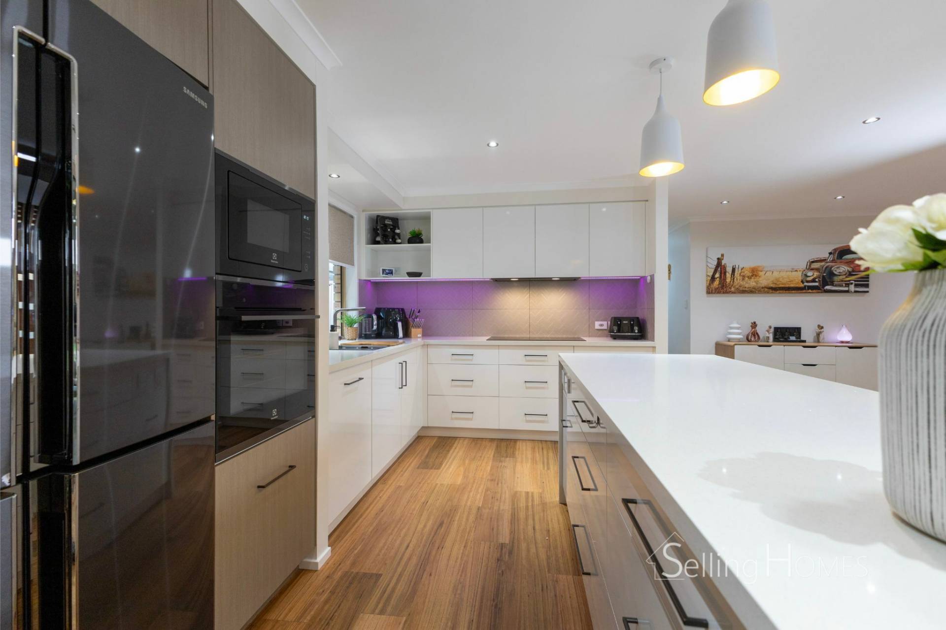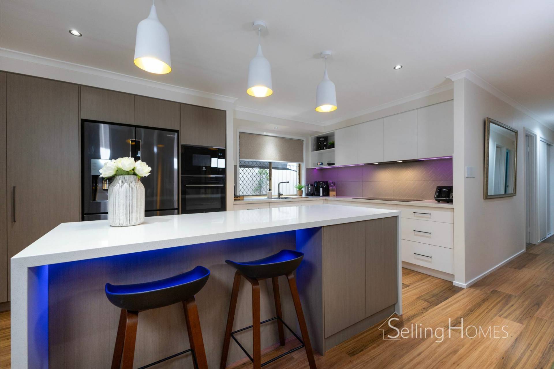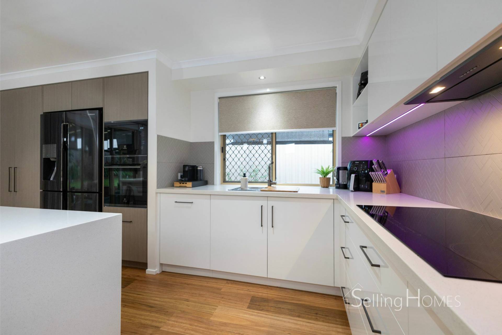 The luxurious kitchen flows into the living and dining areas, creating a communal hub where family and friends can gather and enjoy quality time. It features a breakfast bar, stone waterfall benchtops, an integrated dishwasher, built-in microwave, plumbed fridge space, and ample cupboard and drawer space with soft-close features. The 900mm cooktop, built-in range hood, USB power points, and smart colour-changing lights add both functionality and flair—making it the perfect space for entertaining or preparing your favourite meals.