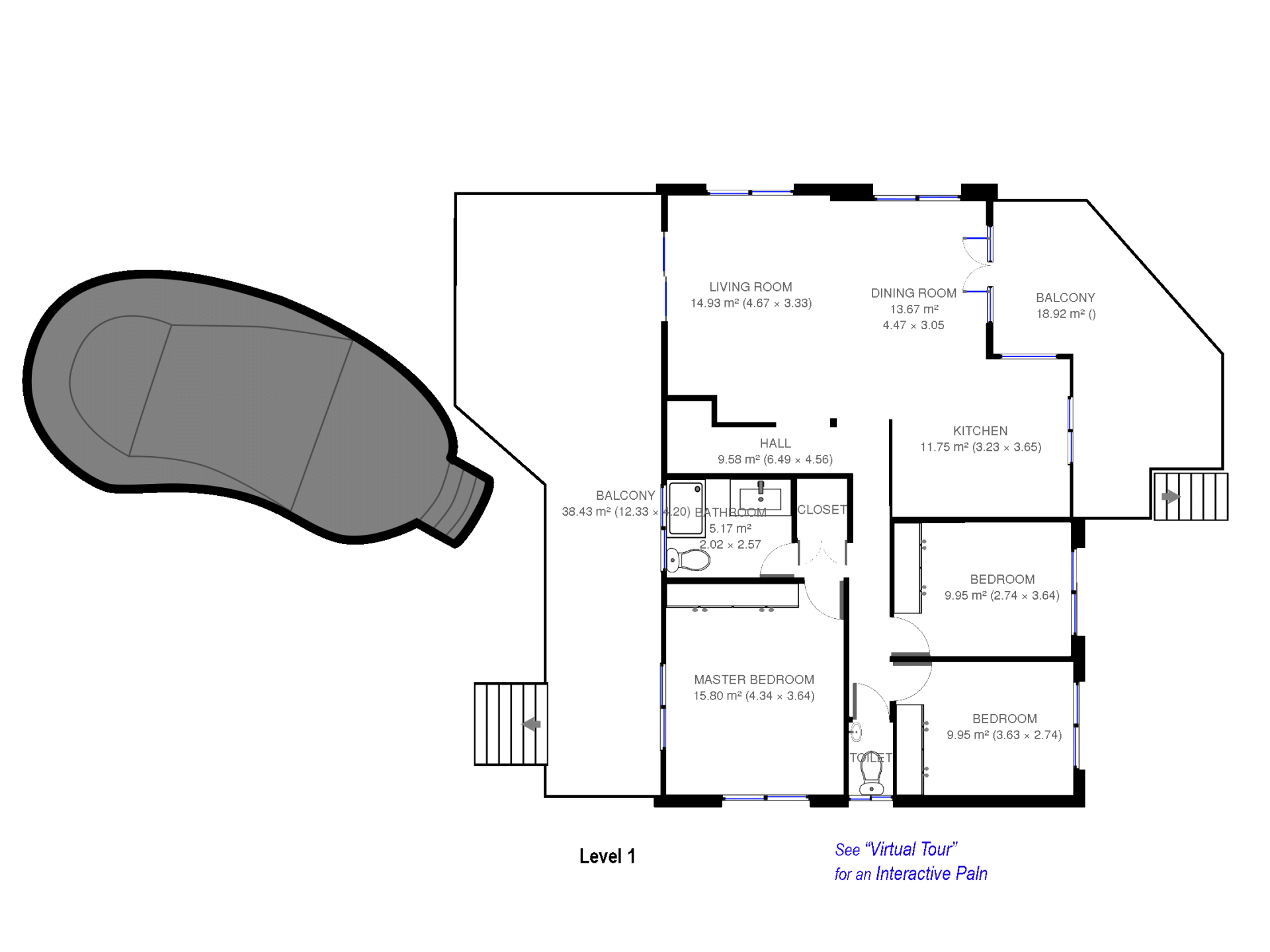 An open floor plan creates a living space that merges with a large deck front and back, to encourage a seamless flow between indoors and out and overlooks the sparkling pool and surrounding deck areas and grassy back yard.