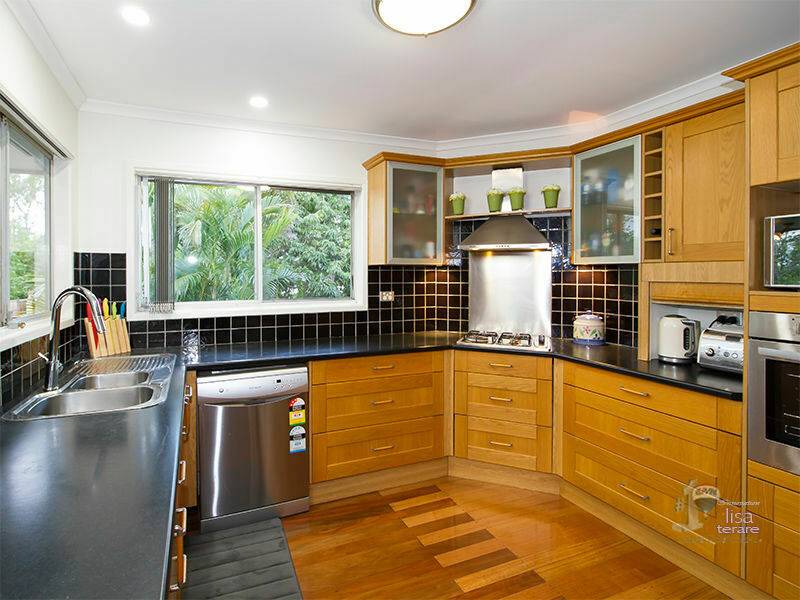 - Central kitchen with timber cabinetry, plenty of storage and gas cooking
