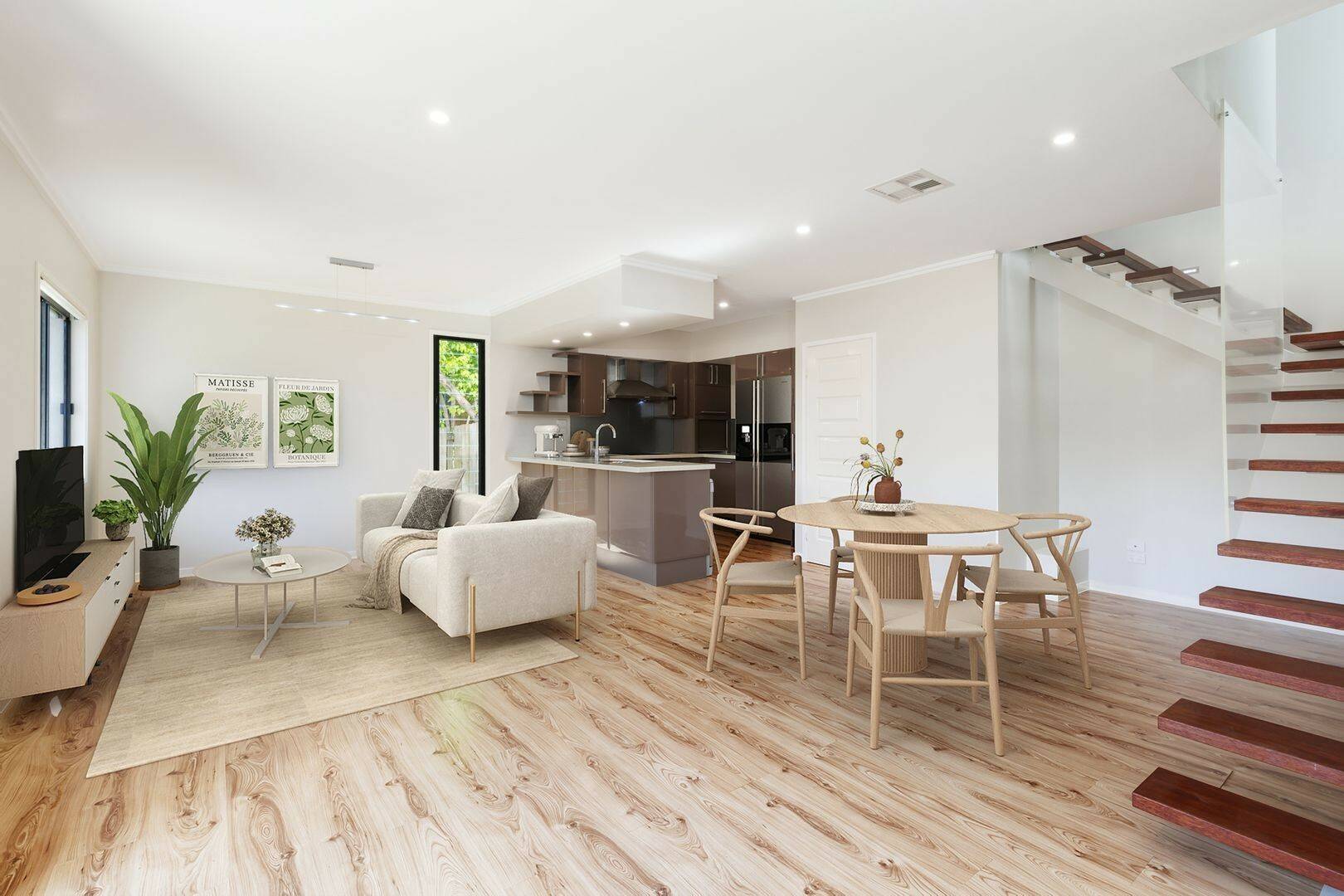 Spread across two light-filled levels, this modern home boasts an open-plan living and dining area, complemented by a sleek downstairs powder room. A striking floating staircase leads to two generously proportioned bedrooms and a beautifully renovated main bathroom, bathed in natural light with one car parking space available.