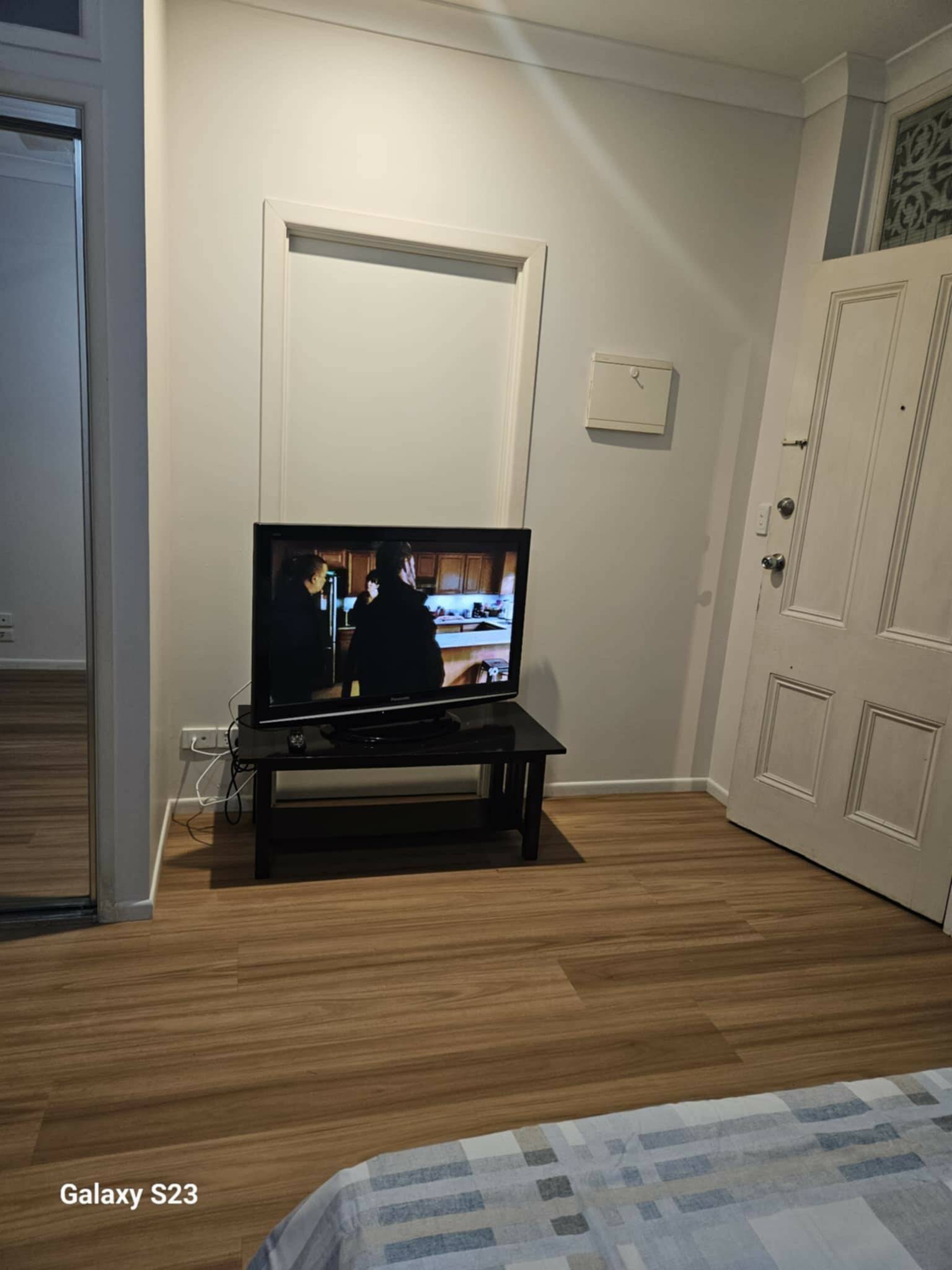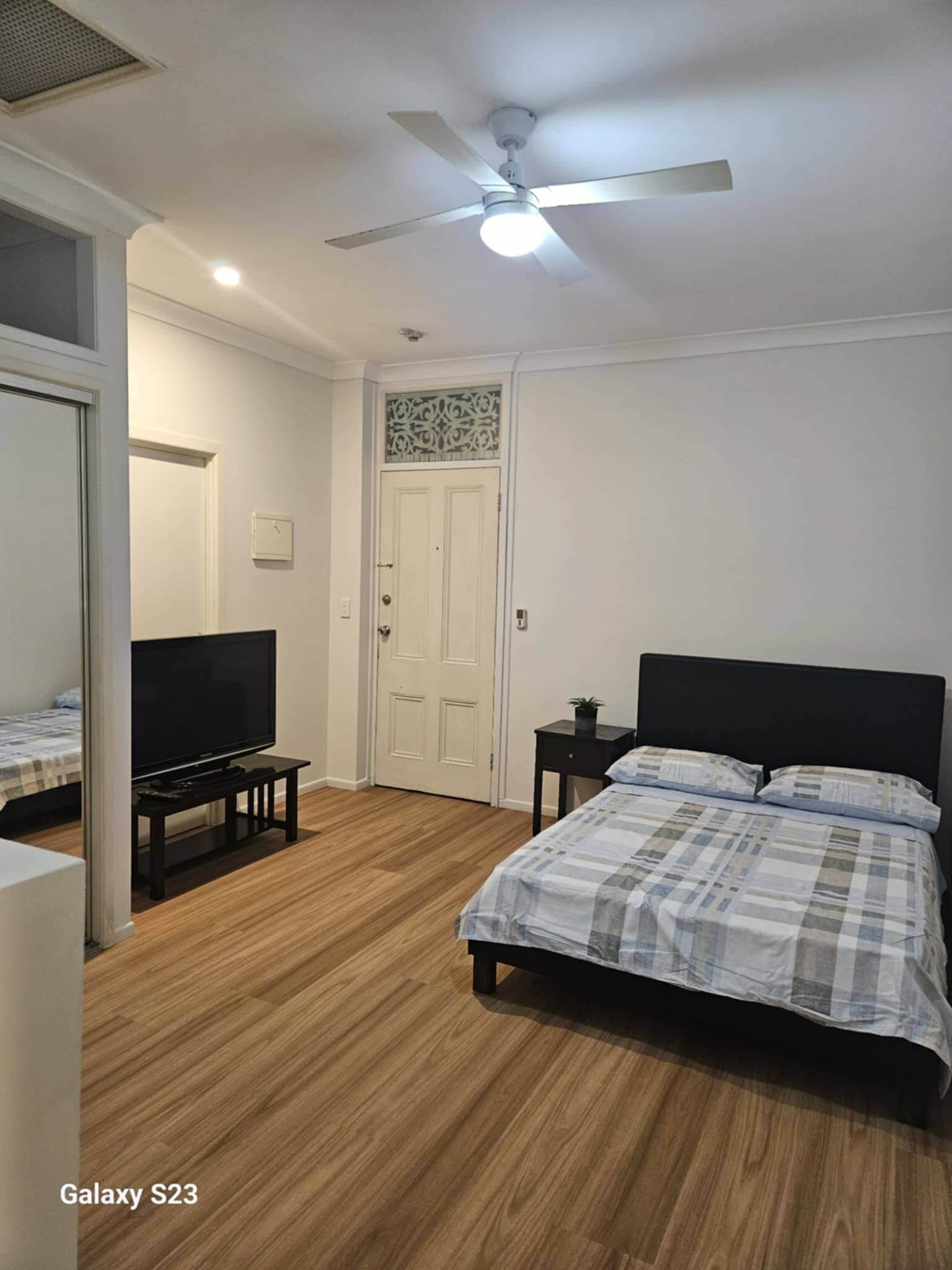 The space is thoughtfully furnished with a Robina double bed and mattress, Panasonic TV on a TV stand, two stools, and a wardrobe cabinet for storage.