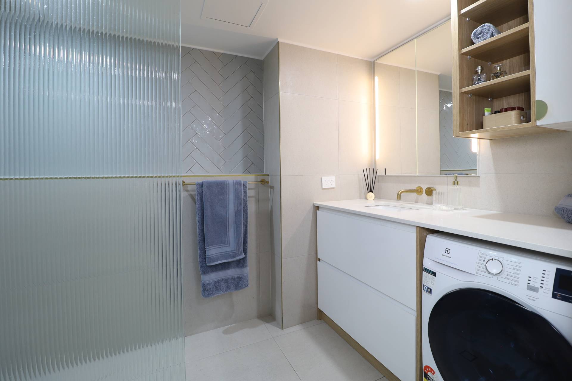 - High quality bathroom with recessed face storage stone bench top deep drawers for extra storage solutions  and integrated cabinetry lighting
