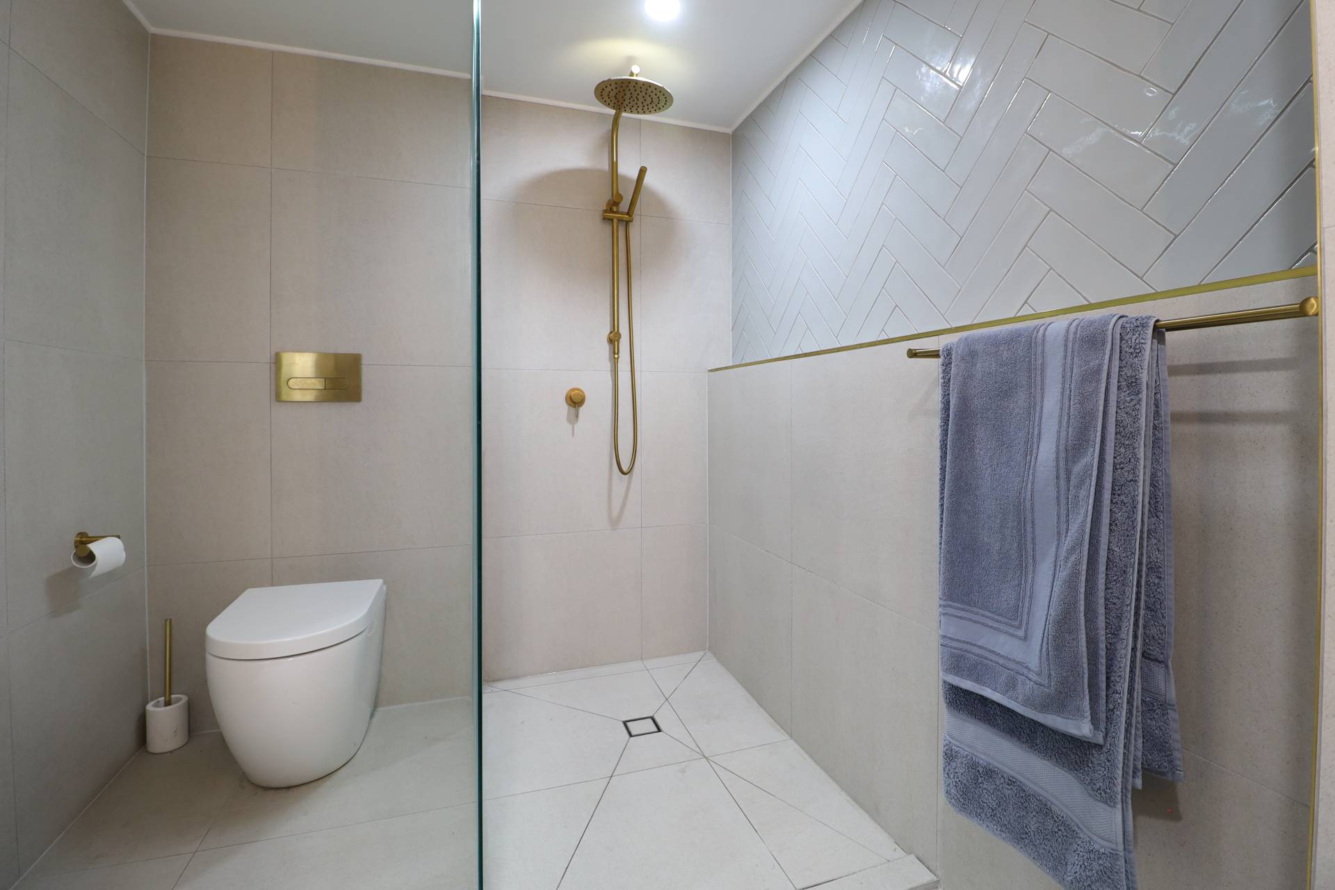 - Quality integrated overhead shower plus hand held in brushed brass finish