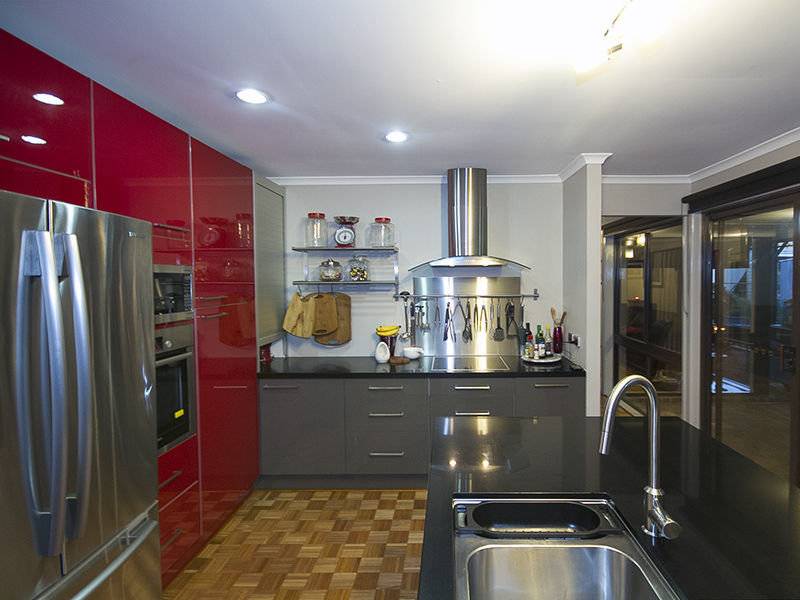 - Central kitchen with stainless steel appliances, stone bench tops and dishwasher