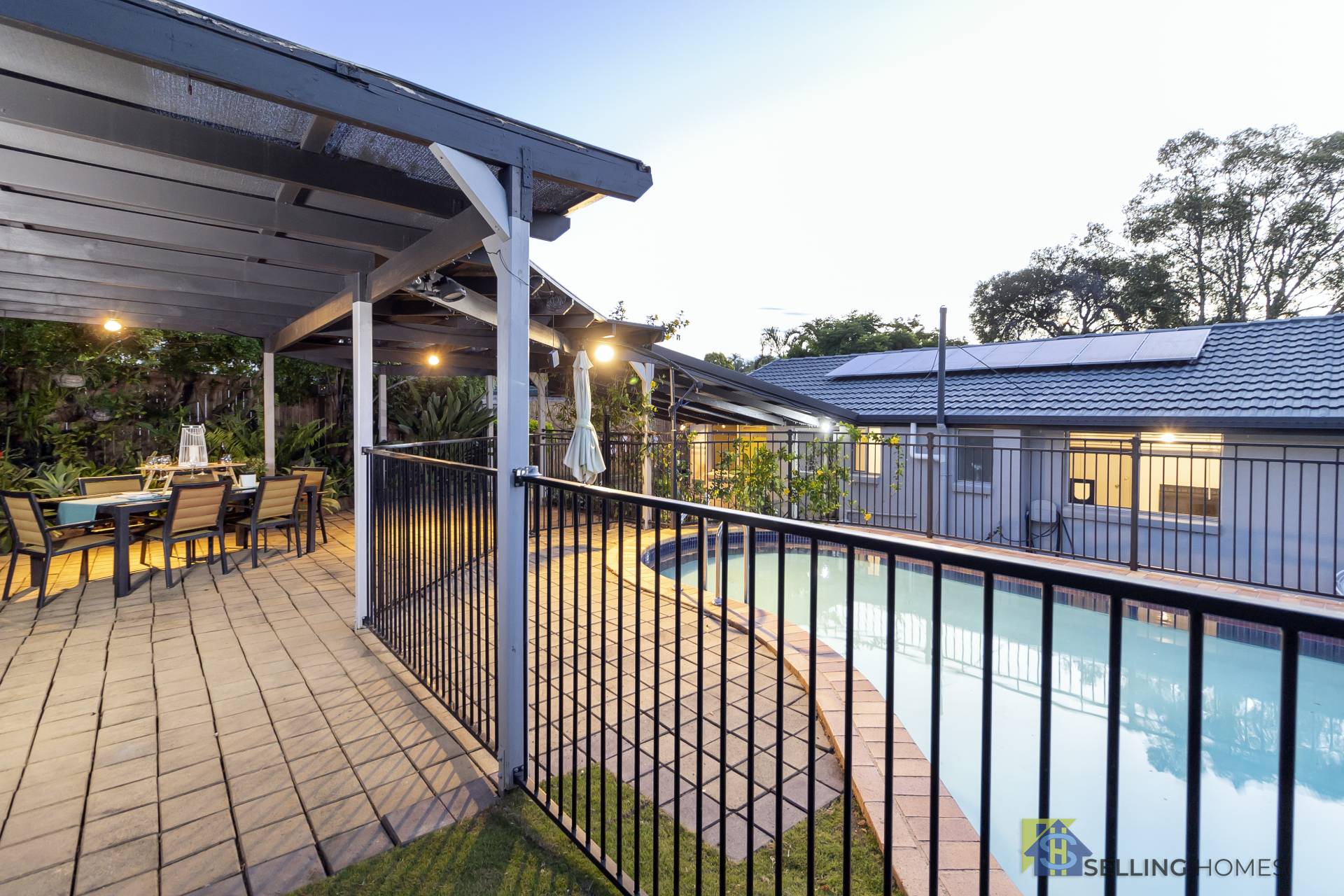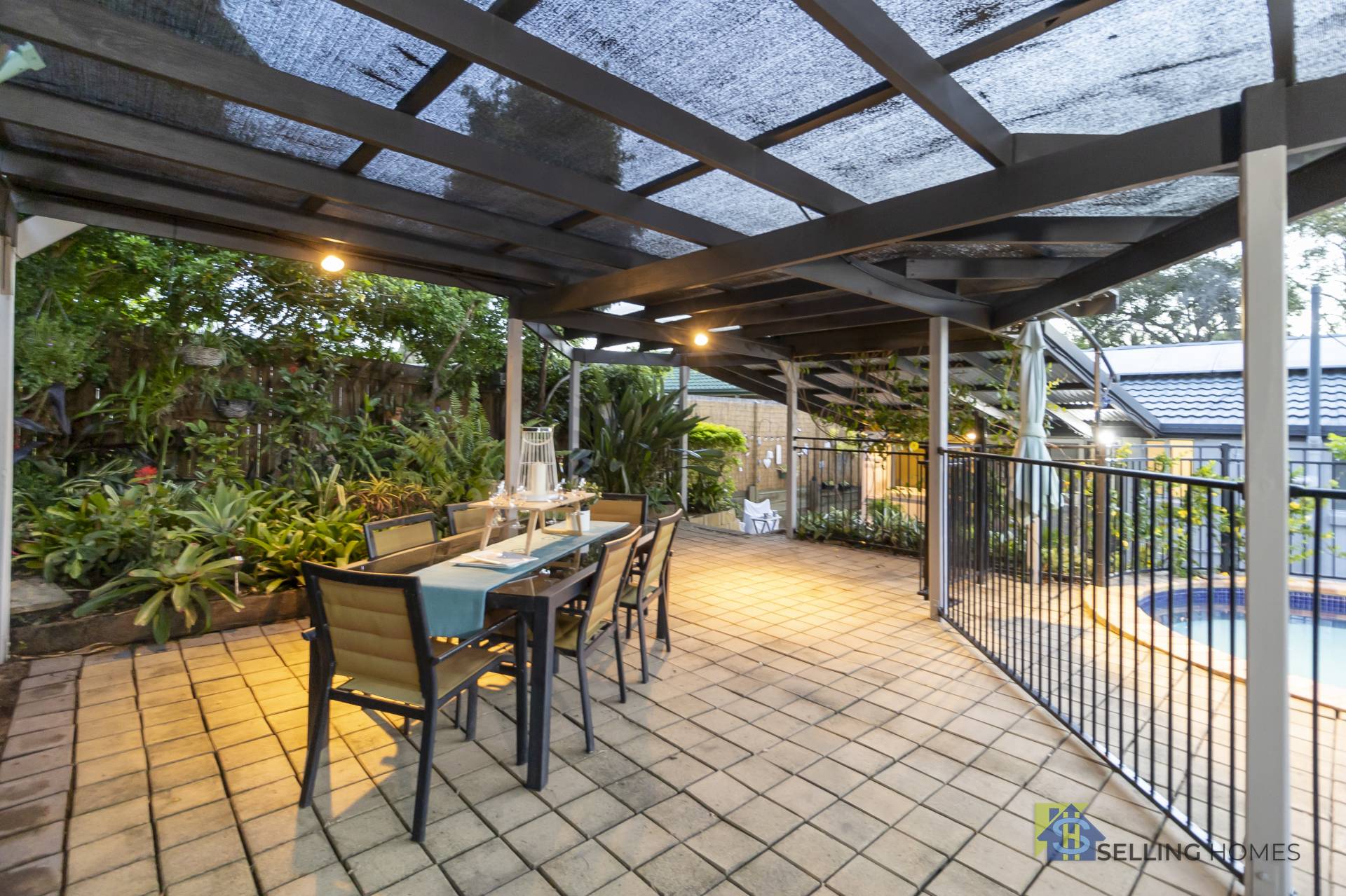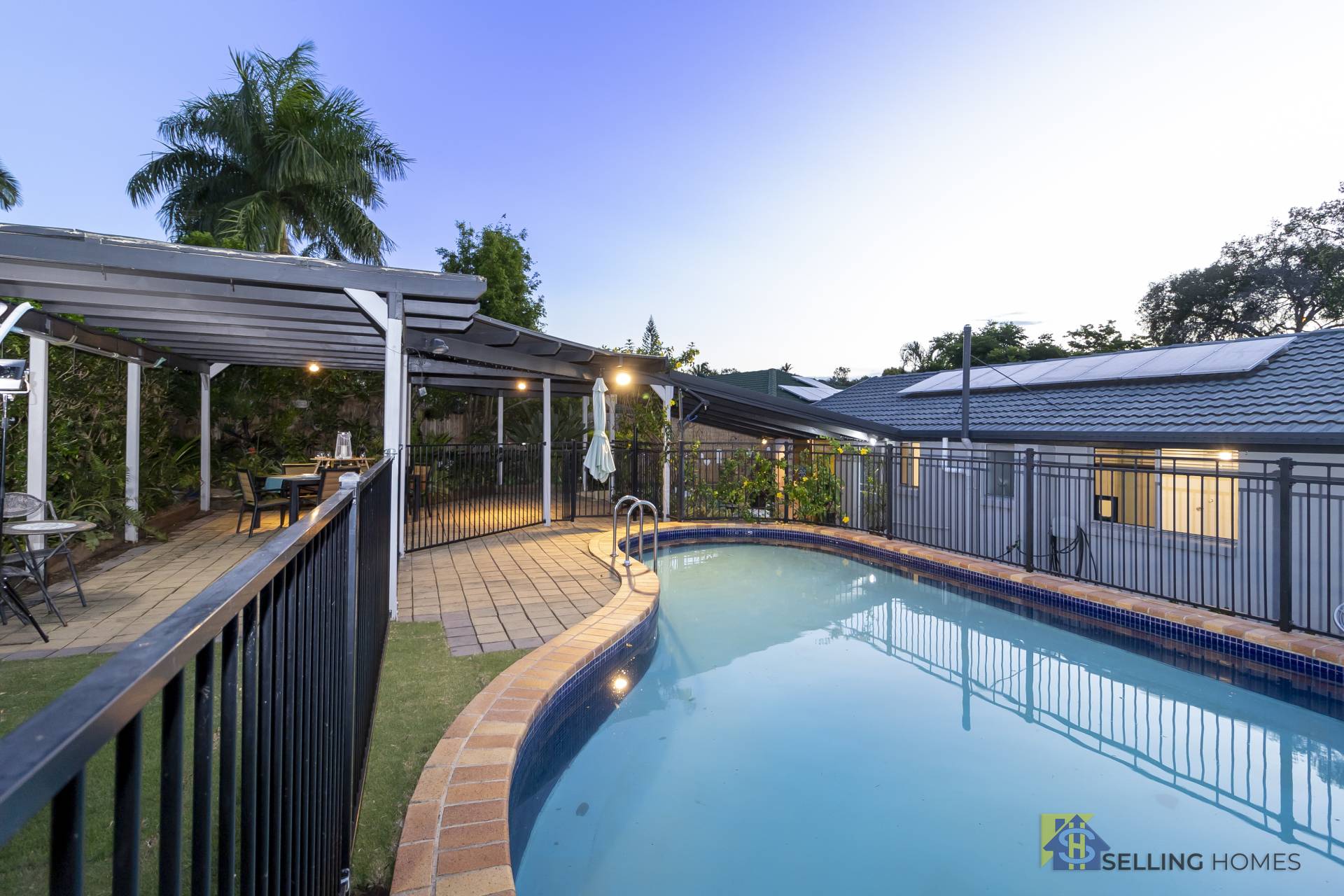 The large salt water pool and paved, covered entertainment area are designed for the whole family to enjoy.