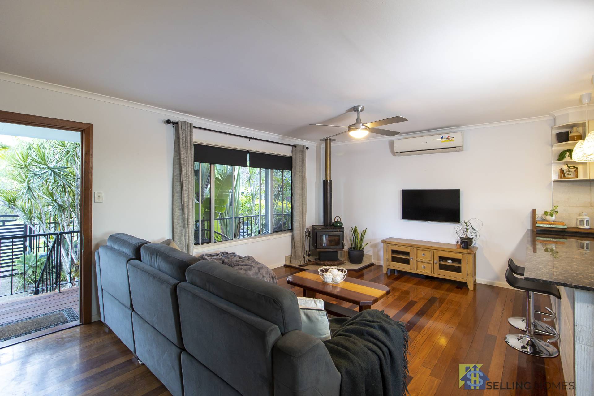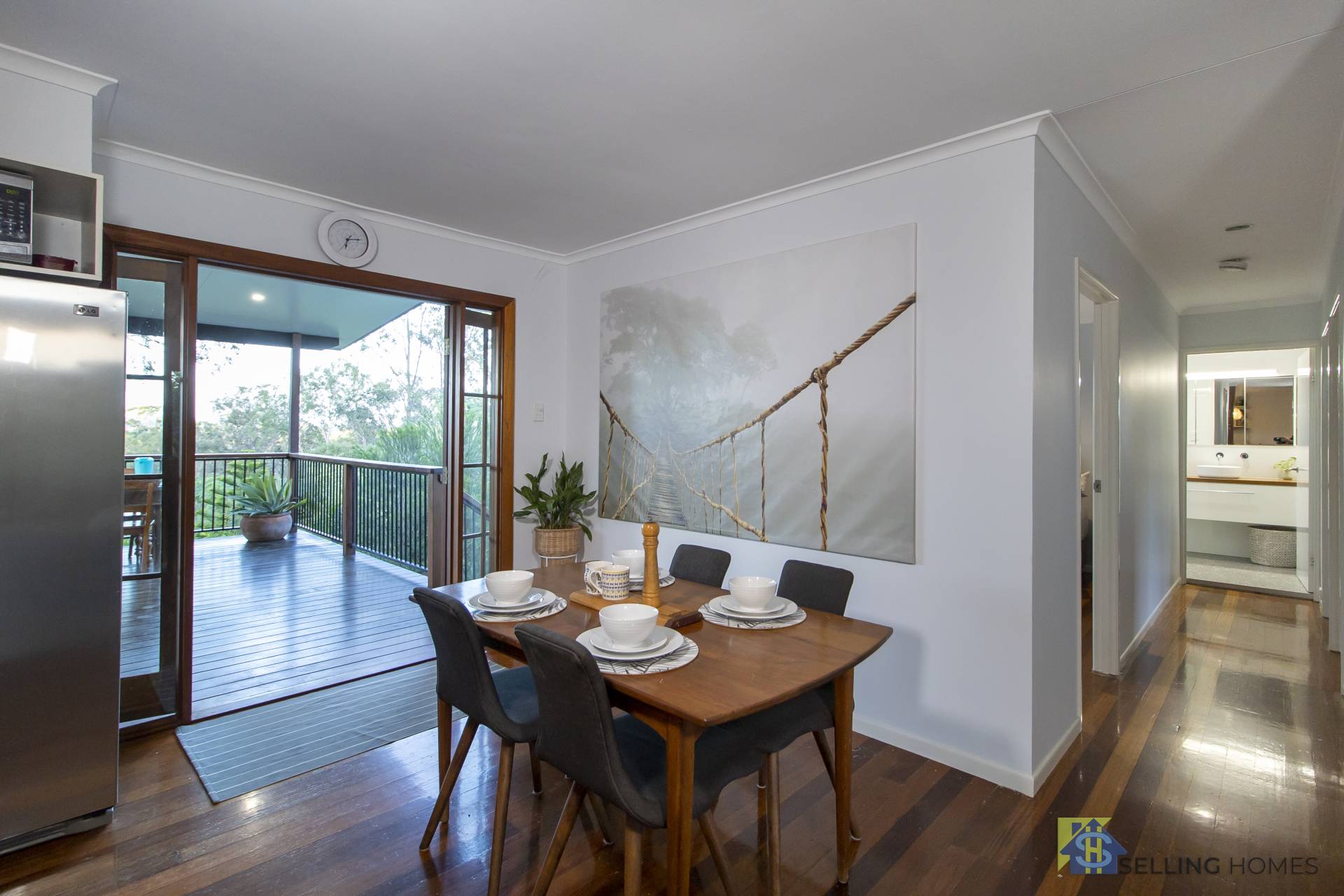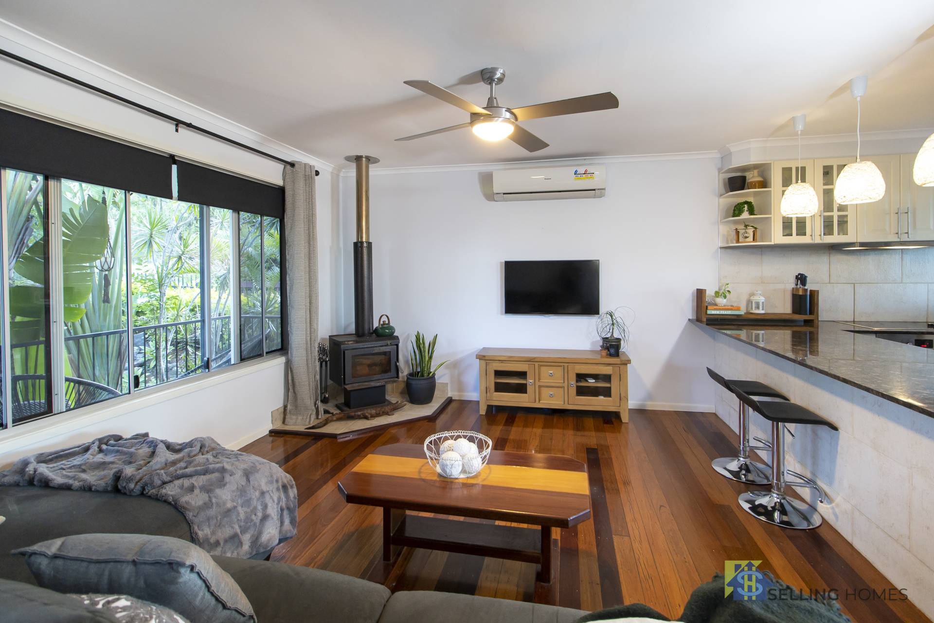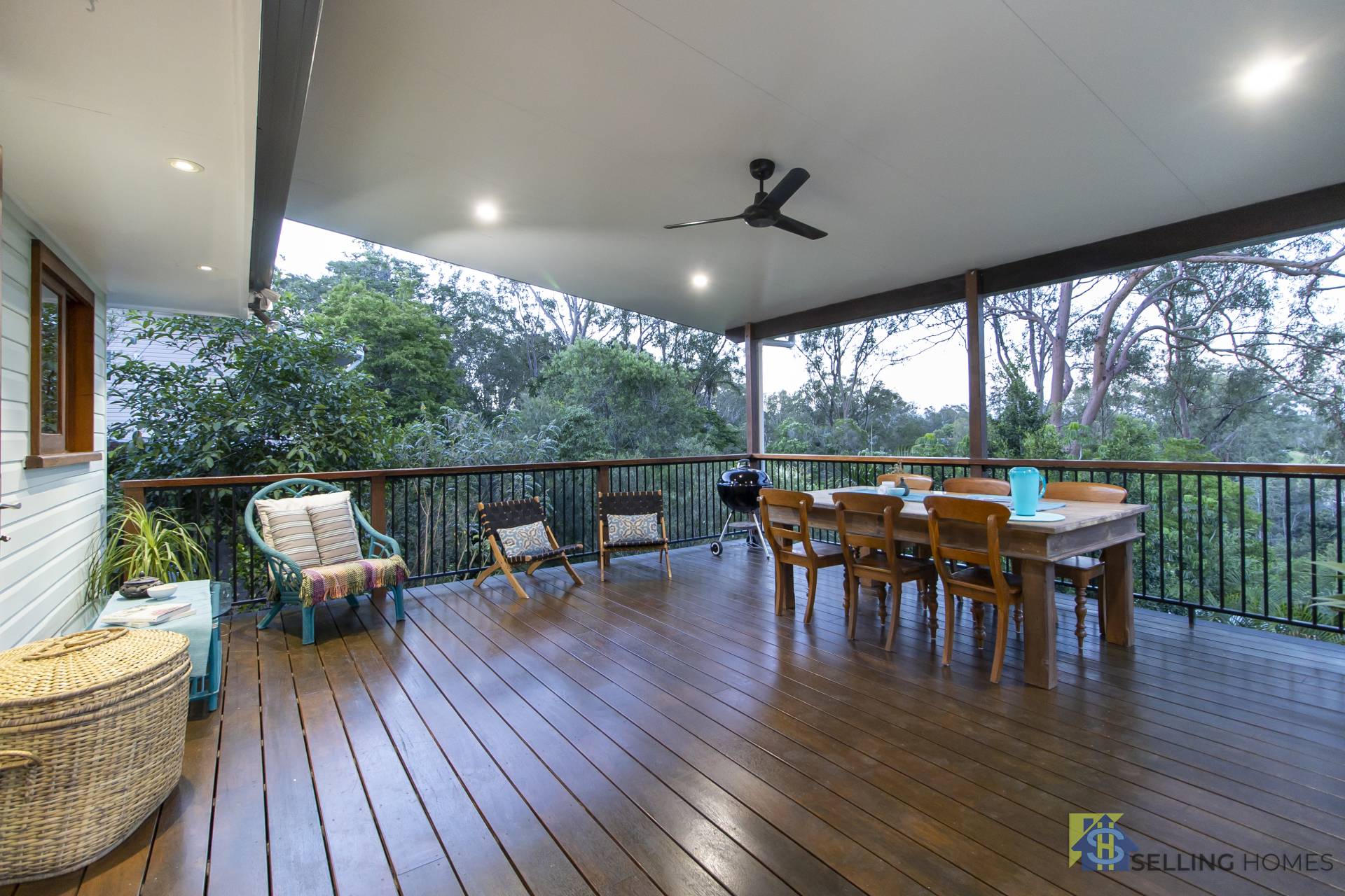 The open plan living and dining room features a wood stove, polished hardwood floor boards and has a welcoming feel upon entry as your gaze is captivated by the spectacular bushland view. This space is kept cool all year round with air conditioning and there are ceiling fans throughout the house. The spacious country style kitchen features an island breakfast bench and flows seamlessly to the entertainment deck overlooking the treetops which is your back yard!