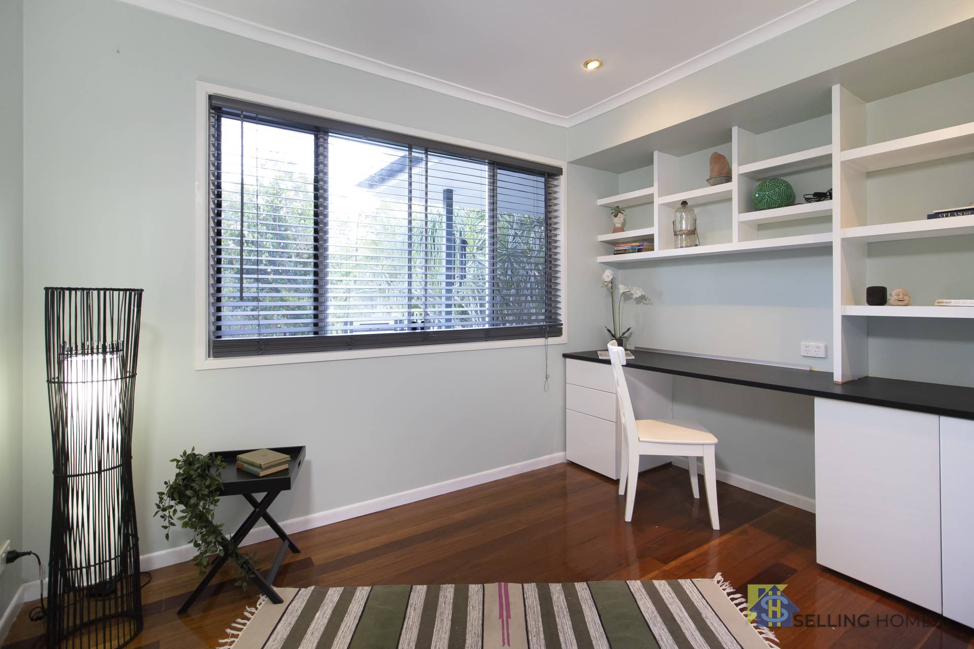 The second bedroom has built-in custom-made shelving and cabinetry perfect for home office.